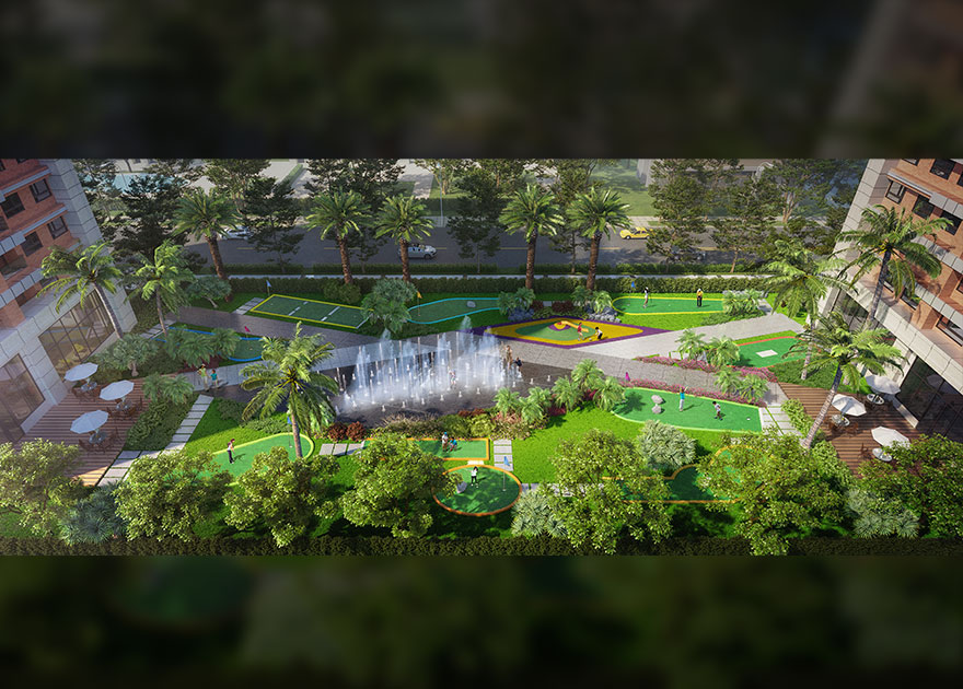 全國住宅首創,約400坪迷你高爾夫水舞運動休旅廣場~包括九洞迷你高爾夫球場、聲光水舞親子樂園、四季主題植栽花園步道•動靜宜人,親子共遊、同好切磋、招待親友,都是日夜皆美的最佳家庭回憶,在家,就能享受世界級休閒運動的世外桃源。
